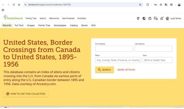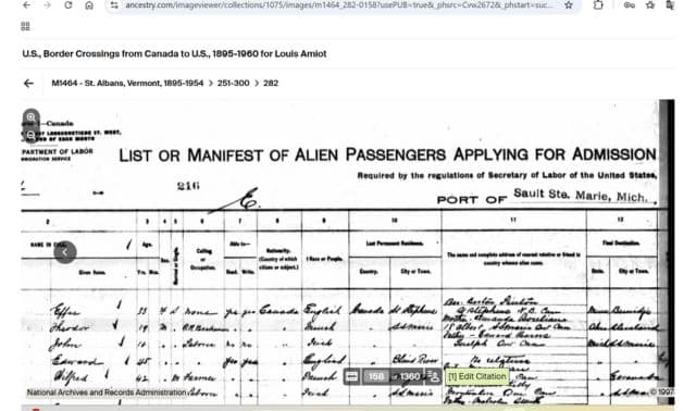 These are examples of the variations of records depending on the location in two different important sites – Ancestry.com and FamilySearch.org. Note that on these images, it is necessary to check the written/typed name of the border entry site! These records for Ancestry and FamilySearch state “St. Albans” in the site’s title, but the actual arrival location is Sault Ste-Marie in Chippewa County, Michigan, not for St. Albans, Vermont. As noted above, the collection references St. Albans, but the records are very much wider coverage (they are stored in St. Albans and, of course, now online!).