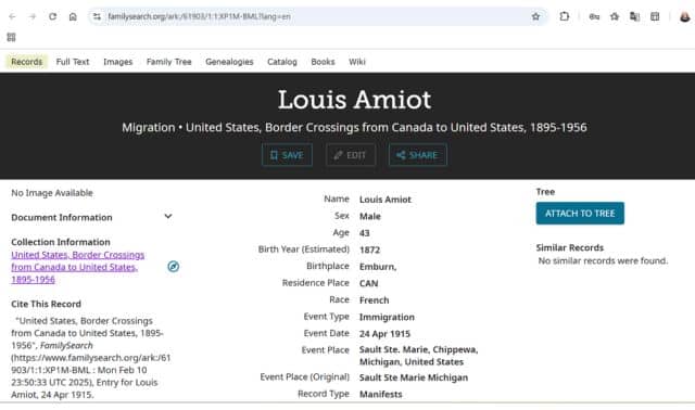 Here, I use a relative as an example: Louis Amiot, who came to the Upper Peninsula of Michigan, through Sault Ste-Marie.