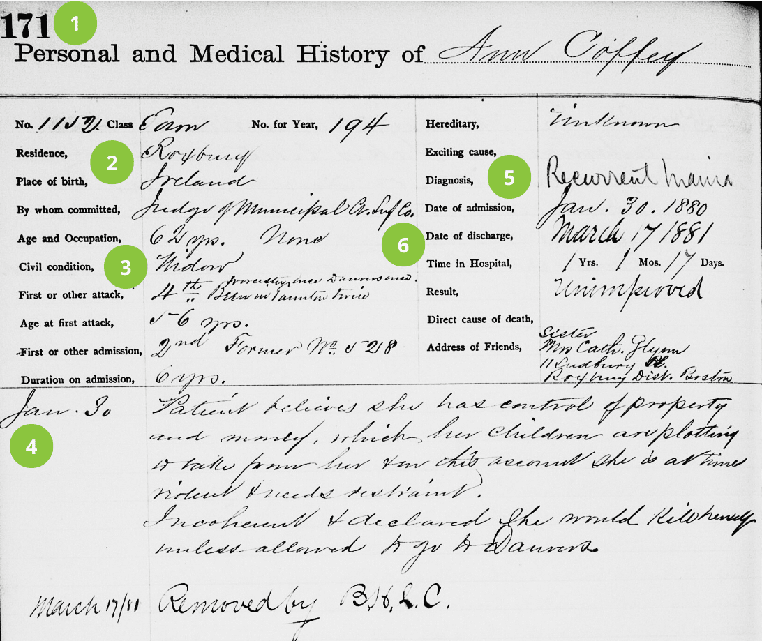 - The hospital record includes a surprising amount of detail about patient Ann Caffey: residence, place of birth, age, occupation and “civil condition” (marital status).