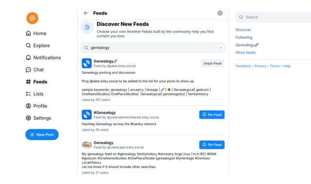 Also select from thousands of different “feeds” to help you connect with like-minded people. To find feeds, select the “Feed” icon (featuring the hashtag/pound symbol). Use the “Discover New Feeds” search bar to find feeds that fit your interests. For example, typing the word genealogy yields several promising results. You can save feeds simply by clicking “Pin Feed.”