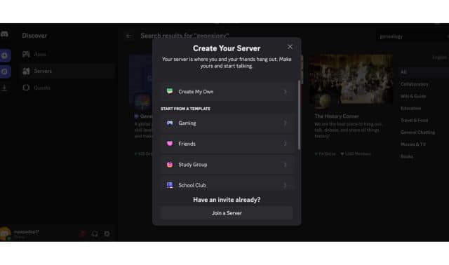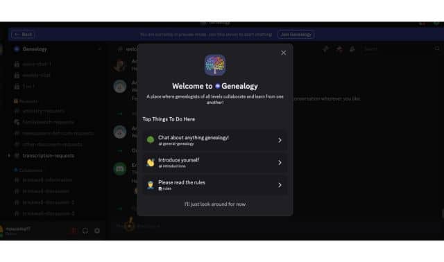 One open server that is perfect for beginner and experienced genealogists alike is Genealogy. With thousands of users, this server promotes collaborating with other genealogists on research projects, seeking help on finding records and information on subscription websites, and just chatting about genealogy.