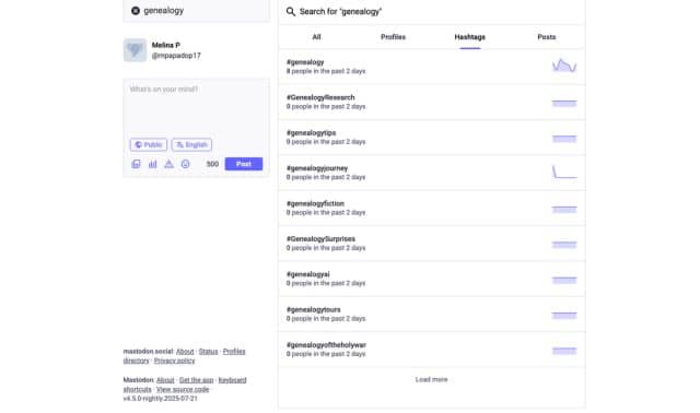 If you’re not sure where to begin, consider searching hashtags to find posts related to your interests. For example, #genealogy may yield some promising results. You can search for hashtags in the search bar. Your search may also turn up related hashtags worth exploring.